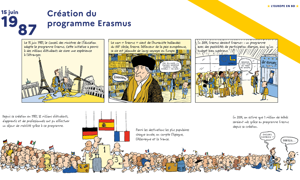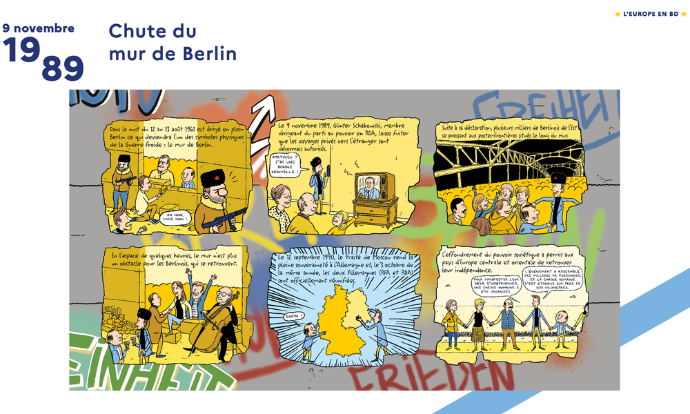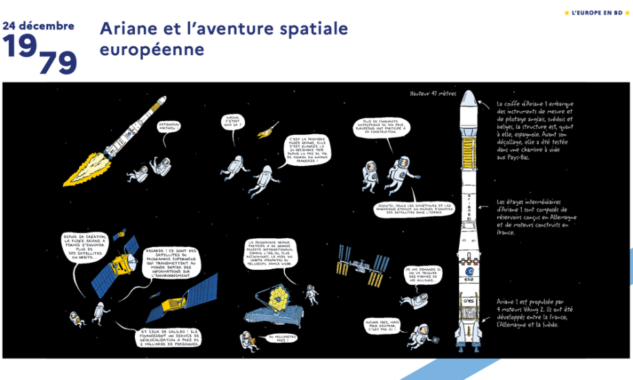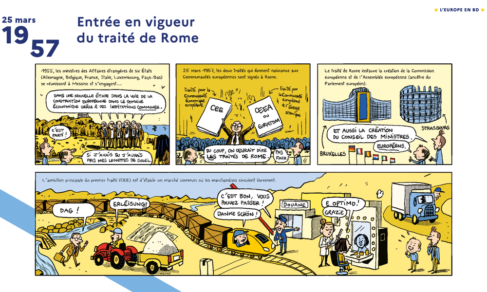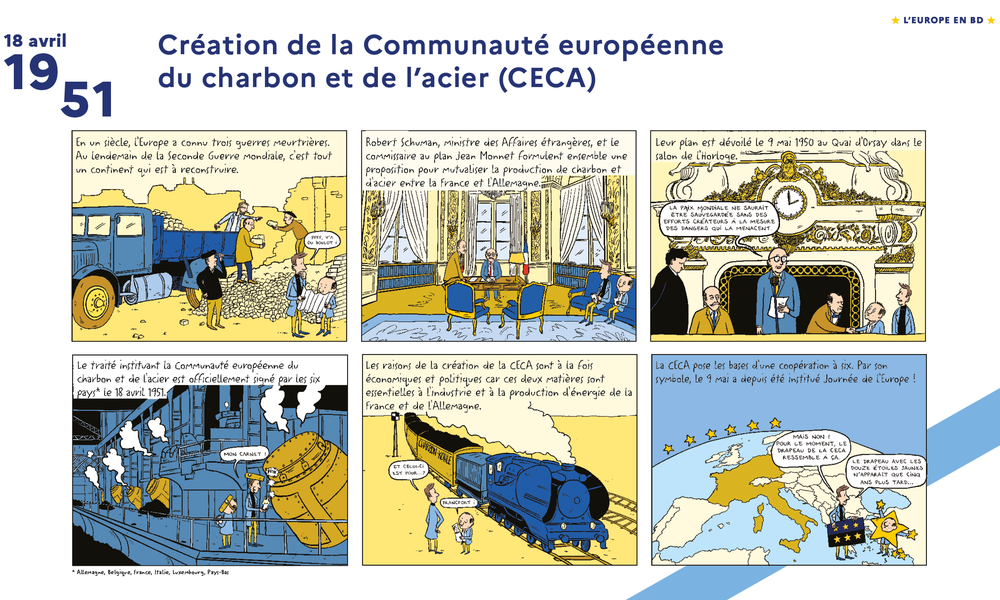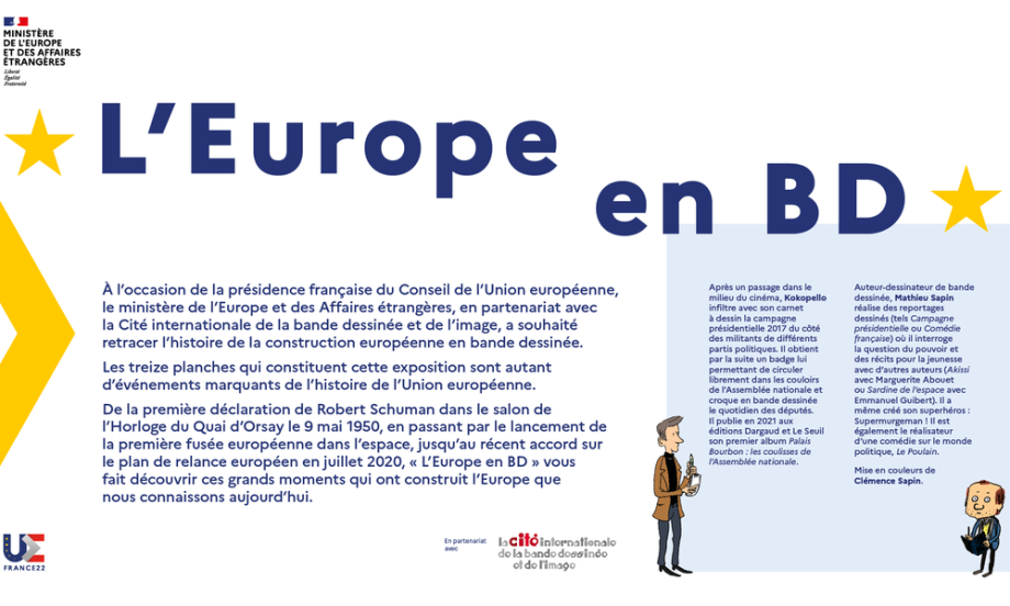 À l’occasion de la présidence française du Conseil de l’Union européenne, le ministère de l’Europe et des Affaires étrangères, en partenariat avec la Cité internationale de la bande dessinée et de l’image, a souhaité retracer l’histoire de la construction européenne en bande dessinée.