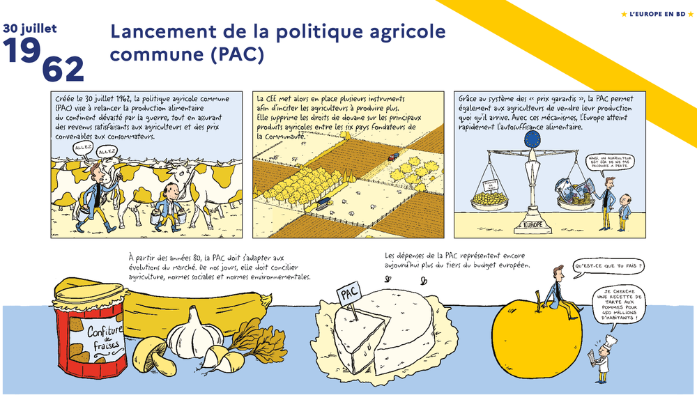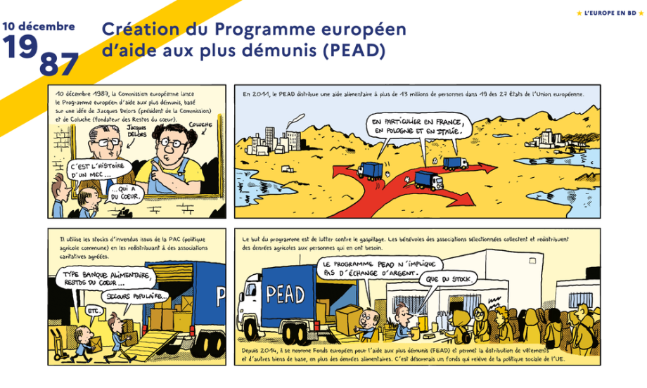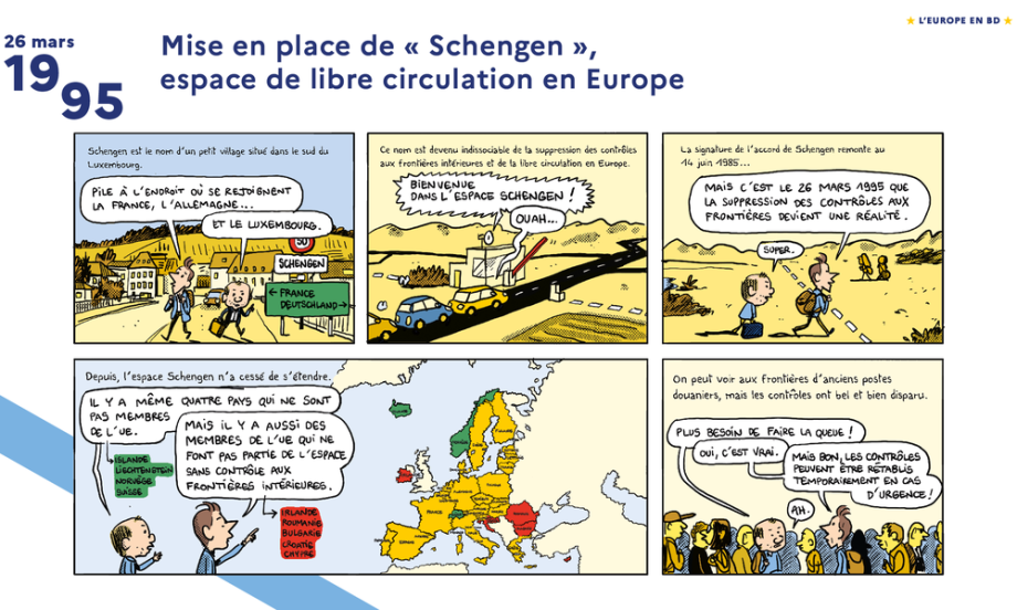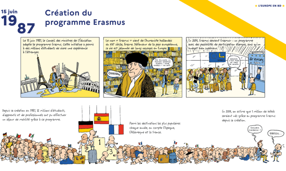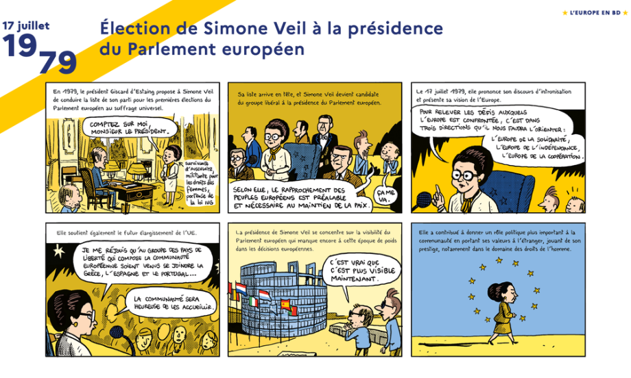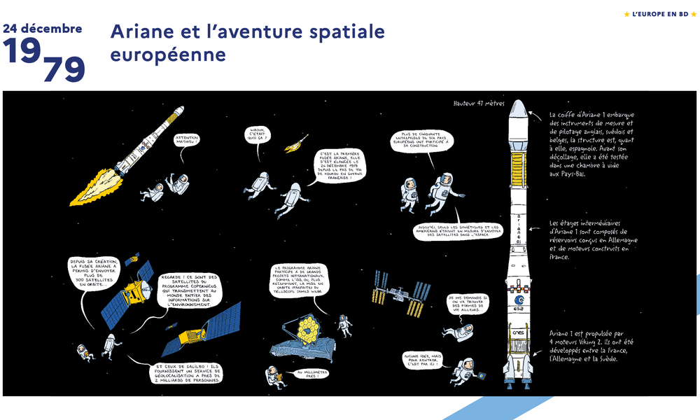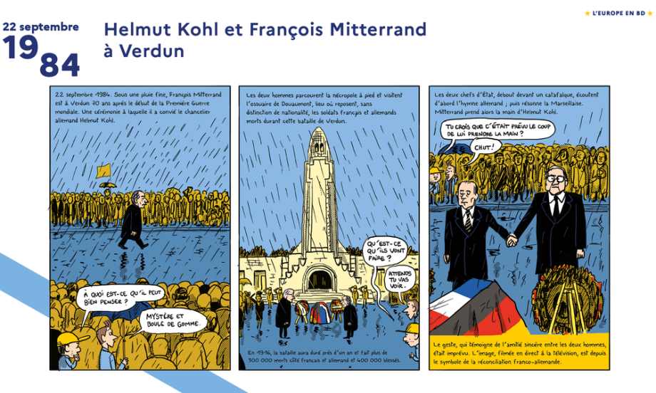 À l’occasion de la présidence française du Conseil de l’Union européenne, le ministère de l’Europe et des Affaires étrangères, en partenariat avec la Cité internationale de la bande dessinée et de l’image, a souhaité retracer l’histoire de la construction européenne en bande dessinée.
