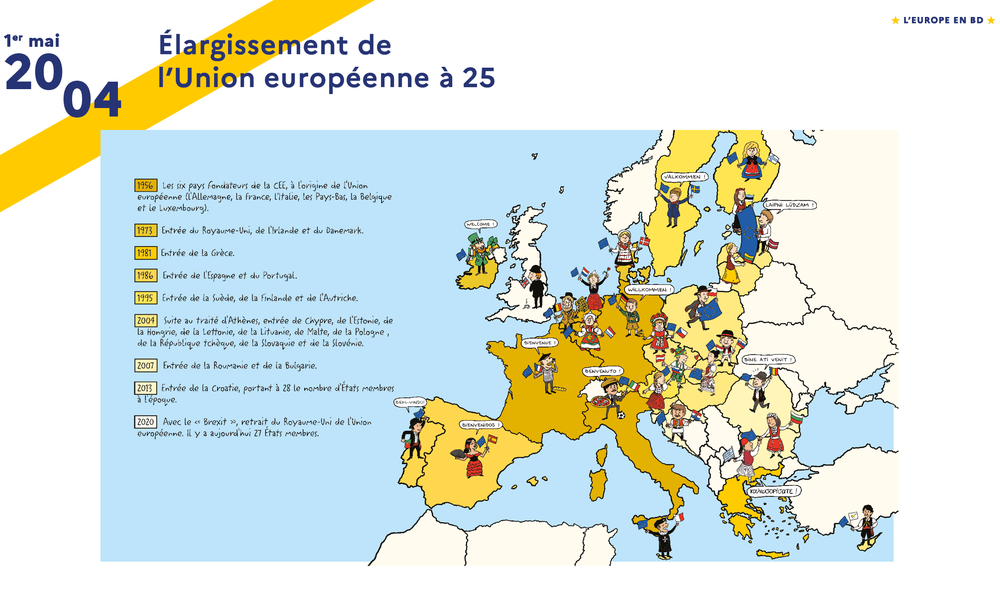 Les 13 planches qui constituent cette exposition sont autant d’évènements marquants de l’histoire de l’Union européenne.