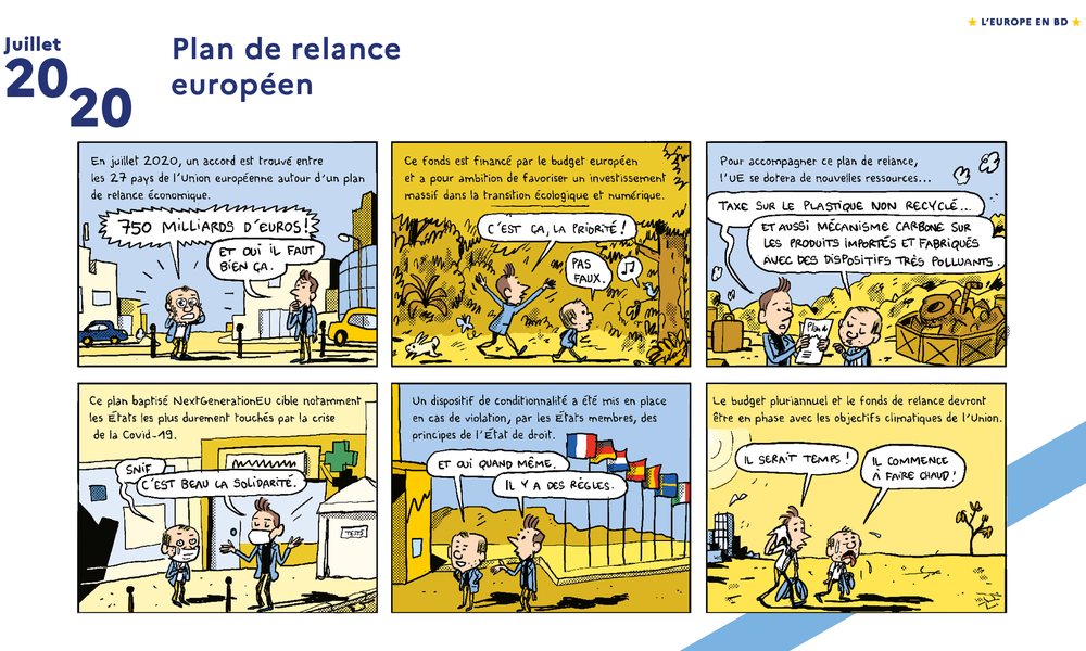 De la première déclaration de Robert Schuman dans le salon de l’Horloge du Quai d’Orsay le 9 mai 1950, en passant par le lancement de la première fusée européenne dans l’espace, jusqu’au récent accord sur le plan de relance européen en juillet 2020, « L’Europe en BD » vous fait découvrir ces grands moments qui ont construit l’Europe que nous connaissons aujourd’hui.