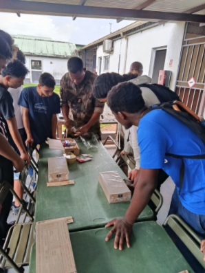 La journée a débuté par un accueil officiel des élèves par les autorités du régiment qui ont salué l’engagement de tous les participants. Cette prise de contact a été suivie d’une visite de la salle d’honneur. À travers les matériels et les récits, l’histoire riche du 9e RIMa a été présentée depuis sa création en 1890, permettant aux élèves de comprendre l’ancrage profond de cette unité dans le territoire guyanais et les traditions de l’Infanterie de Marine.